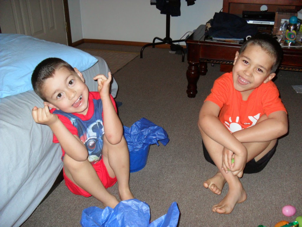 We got a package from Daddy this week! It included new shoes from Grandma, I got some dresses. candy, the boys got another recorded book. There is one point, when Luis is done reading the book, where he says "Jackson, Jacob"... and goes on to say a sweet message to them. After he says their names the boys always say "What?" Like they are talking to him. It's cute.